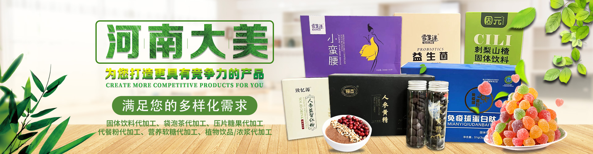 河南大美生物科技股份有限公司是從事顆粒劑、(固體飲料類),壓片糖果代加工等研發(fā)和銷售為一體的生產企業(yè)。公司依托自身的高科技研發(fā)隊伍和營銷團隊,為國內外客戶提供營養(yǎng)食品各劑型和規(guī)格的研制、生產、配方設計、批文申報等服務,并為客戶提供多種形式的流通渠道及產品銷售服務工作。 您的要求就是我們的使命!我們的宗旨是與客戶“合作共贏,攜手向前”,共同創(chuàng)造事業(yè)新的輝煌!